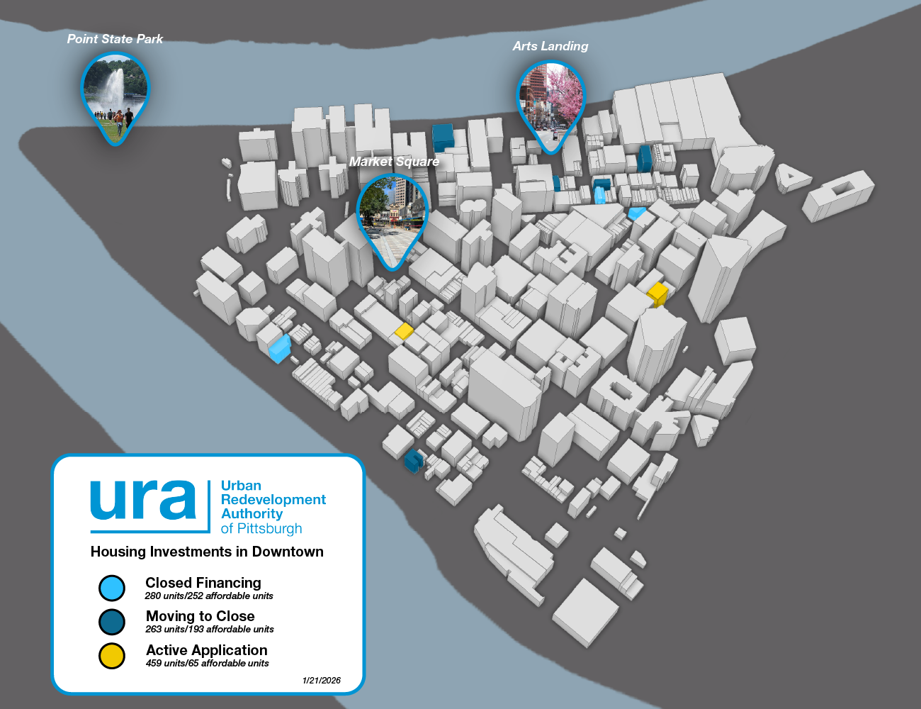 The URA is part of a local coalition working to reposition Downtown Pittsburgh as a vibrant, world-class destination with diverse housing options, enhanced public spaces, and improved safety and cleanliness.