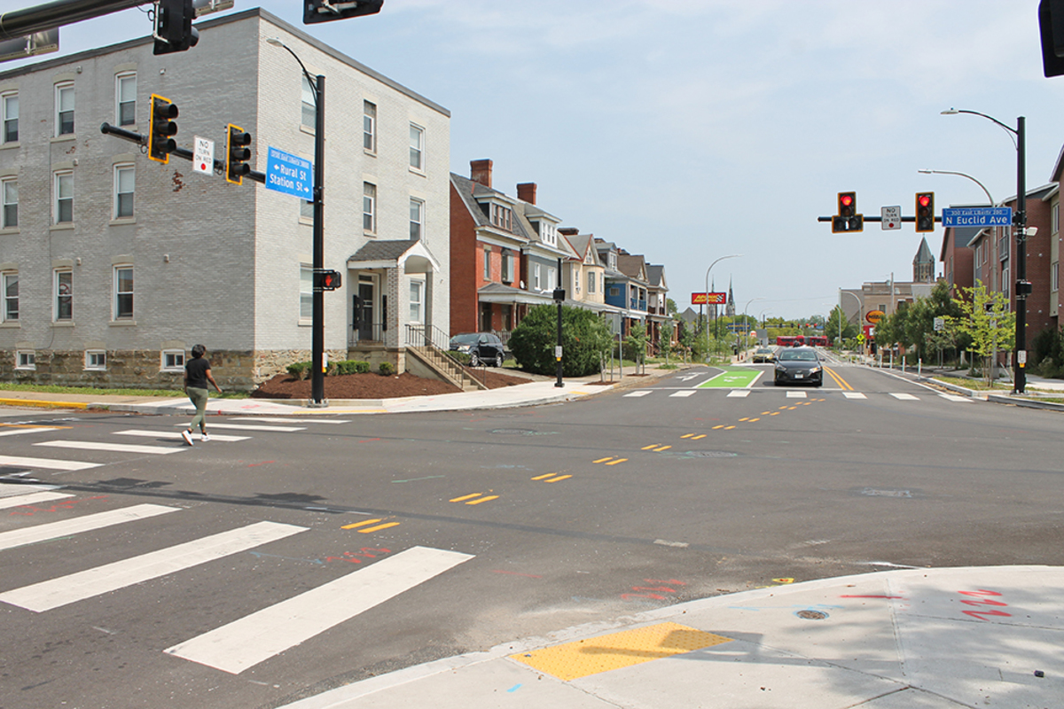 The final phases of the Penn Circle Two Way Conversion will reconnect two abandoned streets (Harvard and Beatty), return two-way vehicular traffic to Euclid Avenue and Station Street, improve crosswalks to make pedestrian movement safer, and install 8,000 linear feet of new protected bike lanes.